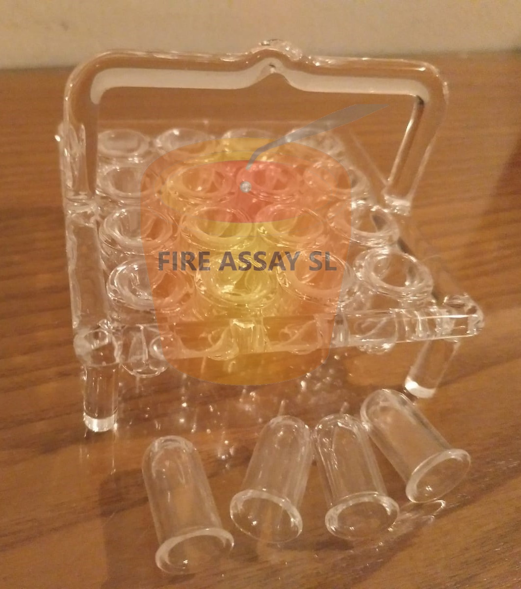 Quartz parting & annealing baskets for 16 samples, that allow to carry out the successive parting and gold annealing operations in the same container, and subsitute, both parting flasks, and gold annealing crucibles.